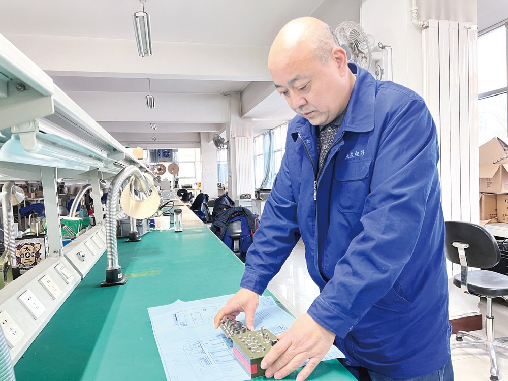 文凯正在检查电路板上钳装工人安装的铆钉等零件是否整齐规范。